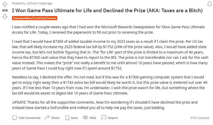 该玩家在帖子最后表示:“如果我要支付1752美元,那么我为什么不直接购买几年 XGPU呢?”,并称将主动放弃领奖。
