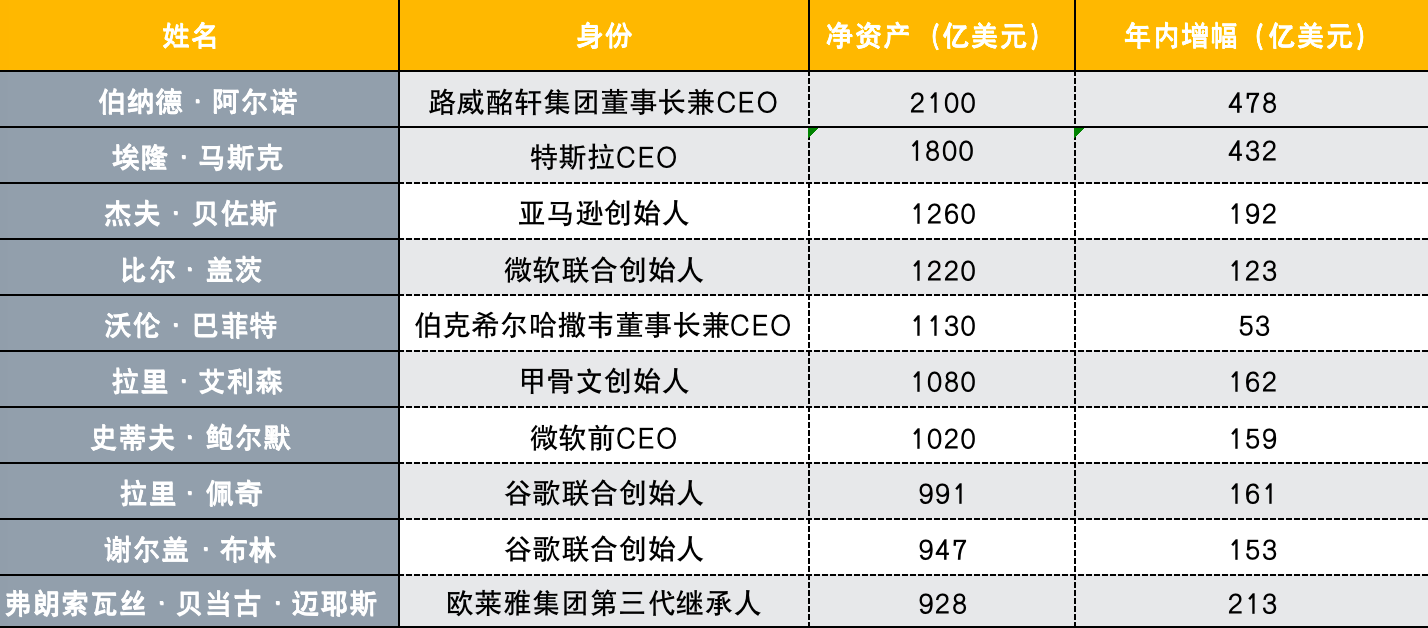 全球前十大富豪当前的净资产在928亿美元和2100亿美元之间,年内增幅在53亿美元和478亿美元之间。
