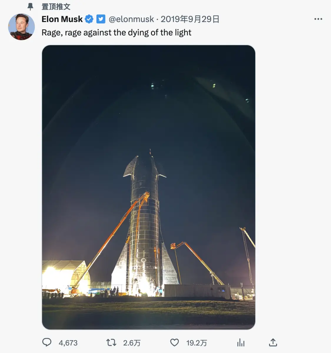Twitter上,马斯克已经把它在2019年9月发布的一条推文置顶。这条推文图文并茂,配图是夜色中的星际飞船,文字则是“狂愤怒,对光明的消逝而愤怒”(Rage, rage against the dying of the light)。