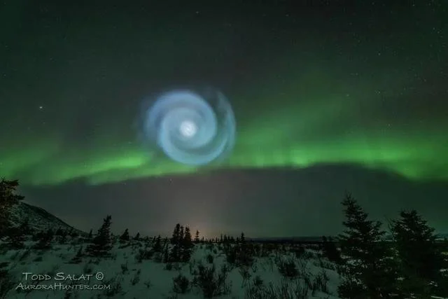 报道称,目睹这一“奇观”的人中包括托德·萨拉特,他是一名专门在户外拍摄北极光的摄影师。当地时间15日凌晨,正在进行日常工作的他捕捉到了这一景象。报道称,根据萨拉特的描述,当时北边地平线上突然出现了一道明亮的光,随着它的靠近,这股光迅速呈现出螺旋形。随后,蓝白色的螺旋似乎开始快速移动。萨拉特说,大约五分钟后,它几乎就在头顶上了。