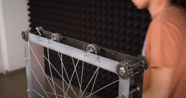 为了制造该车的方形轮子,该网友建造了一个沉重的支撑金属框架,他在每侧增加了一个旋转齿轮和几个滚动轴承。他在旋转齿轮上加上自行车链条,绕着车架转动。