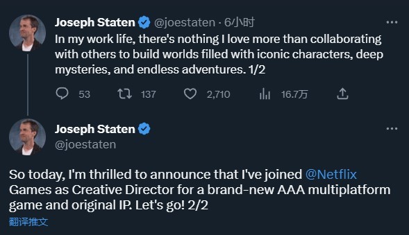 斯坦顿在加入网飞游戏后,表示他将负责开发一个全新的跨平台3A游戏项目,这将是网飞游戏首次尝试制作原创的大型游戏。