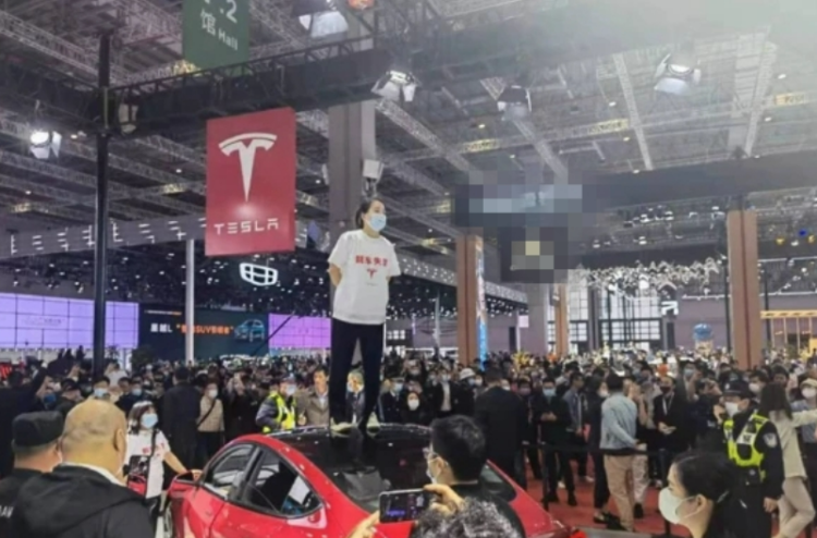2021年的上海车展上,一位身穿印有“刹车失灵”T恤的车主站到了特斯拉展区一辆车的车顶上,大喊大叫进行维权,引发现场围观和拍摄。这位女士随后很快就被特斯拉现场工作人员和保安拉走。