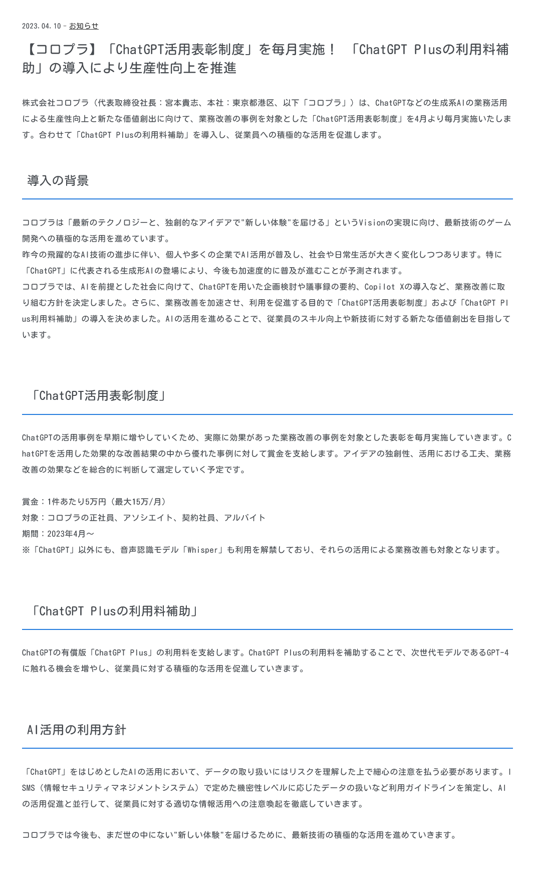同一份公告中 COLOPL 表示,它计划使用 ChatGPT 来进行计划审查和总价会议记录等工作,以“为 AI 驱动的社会做准备”。