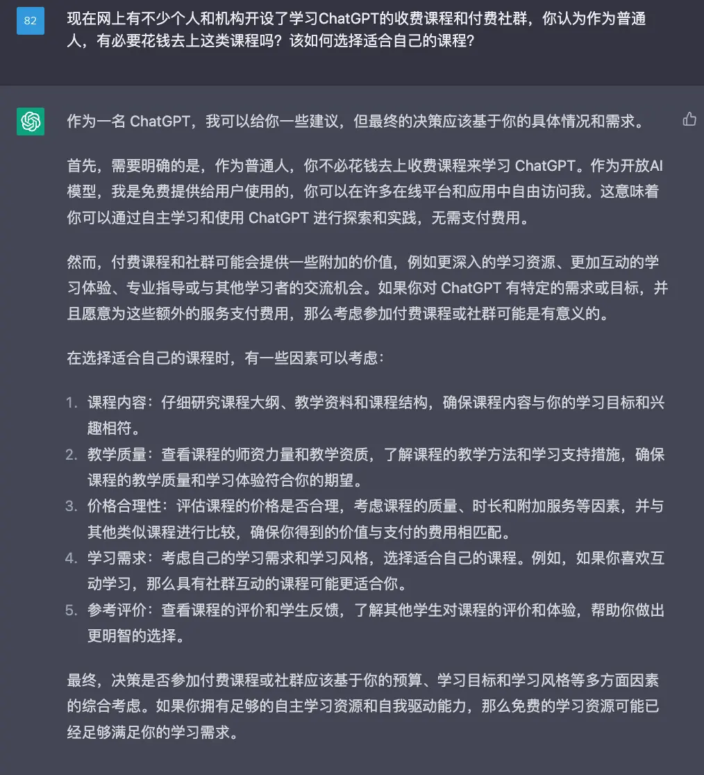 我们还为此征求了ChatGPT“本尊”的意见。它的回答倒是很干脆:“作为普通人,你不必花钱去上收费课程来学习ChatGPT”。