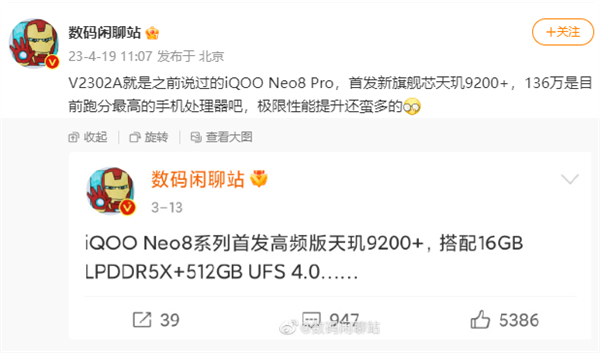 值得一提的是,数码博主“数码闲聊站”也确认,安兔兔发现的这款V2302A,就是之前曝料过的iQOO Neo8 Pro。