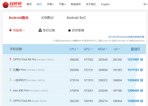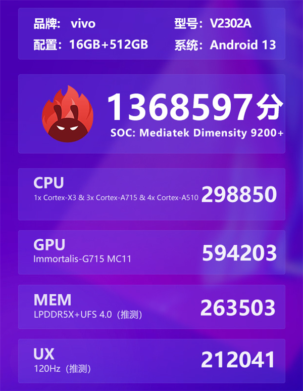 今天,安兔兔官方微博发布消息称,在后台发现代号为“V2302A”的一款新机,搭载天玑9200+芯片跑分超136万,这个性能绝对是安卓一的表现。据网上爆料猜测,极有可能是联发科新旗舰天玑9200+的首发机型,也就是iQOO Neo8 Pro。