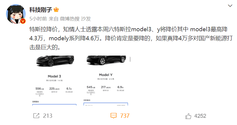 该博主还表示,降价肯定是要降的,但如果真降4万多,对国产新能源打击是巨大的。
