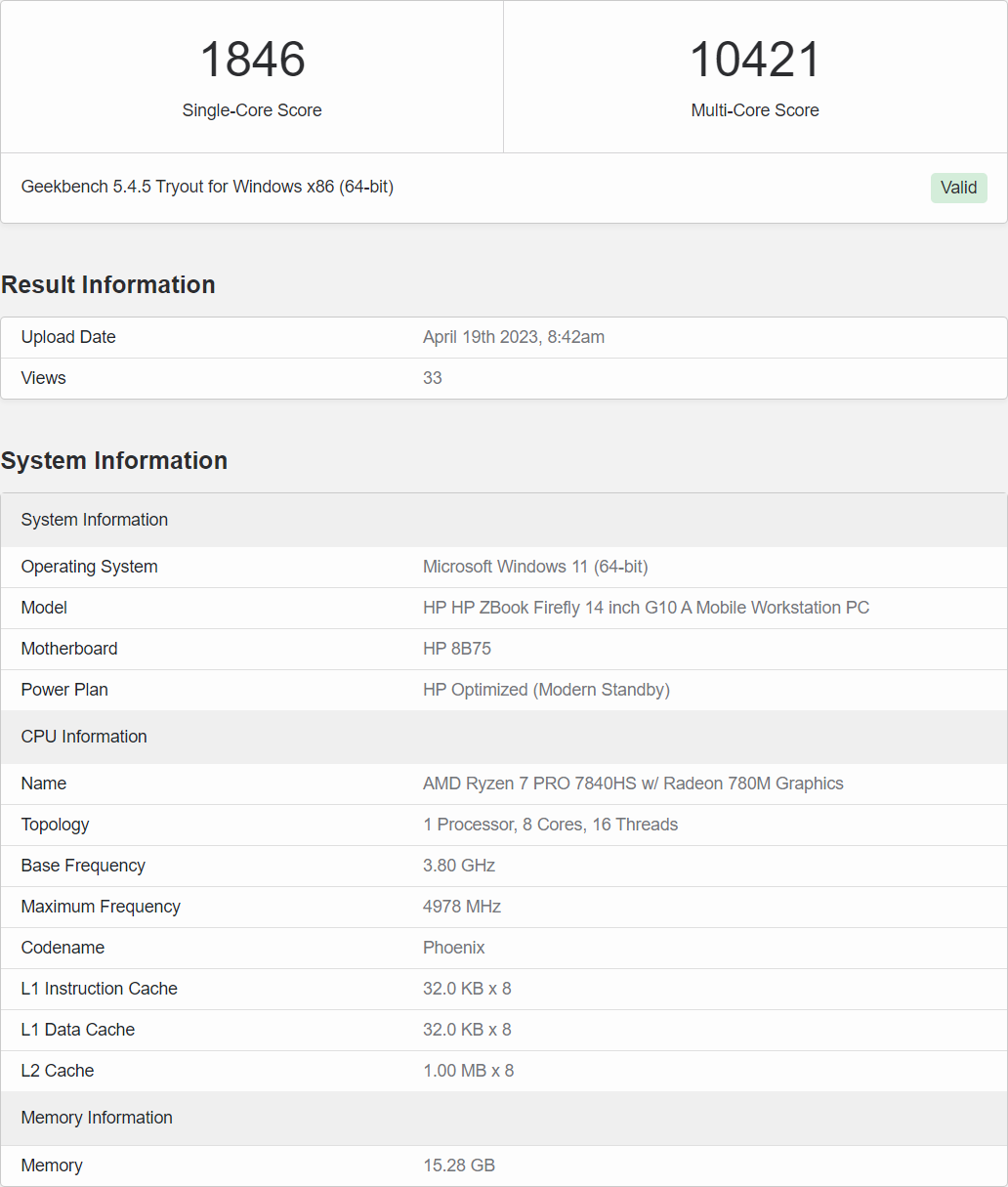 然后是GeekBench 5检测到了锐龙7 PRO 7840HS,规格识别很全:8核心16线程、二级缓存8MB、三级缓存16MB、主频3.8-5.0GHz(其实应该能到5.1GHz)、Radeon 780M核显、12单元/2.7GHz频率。