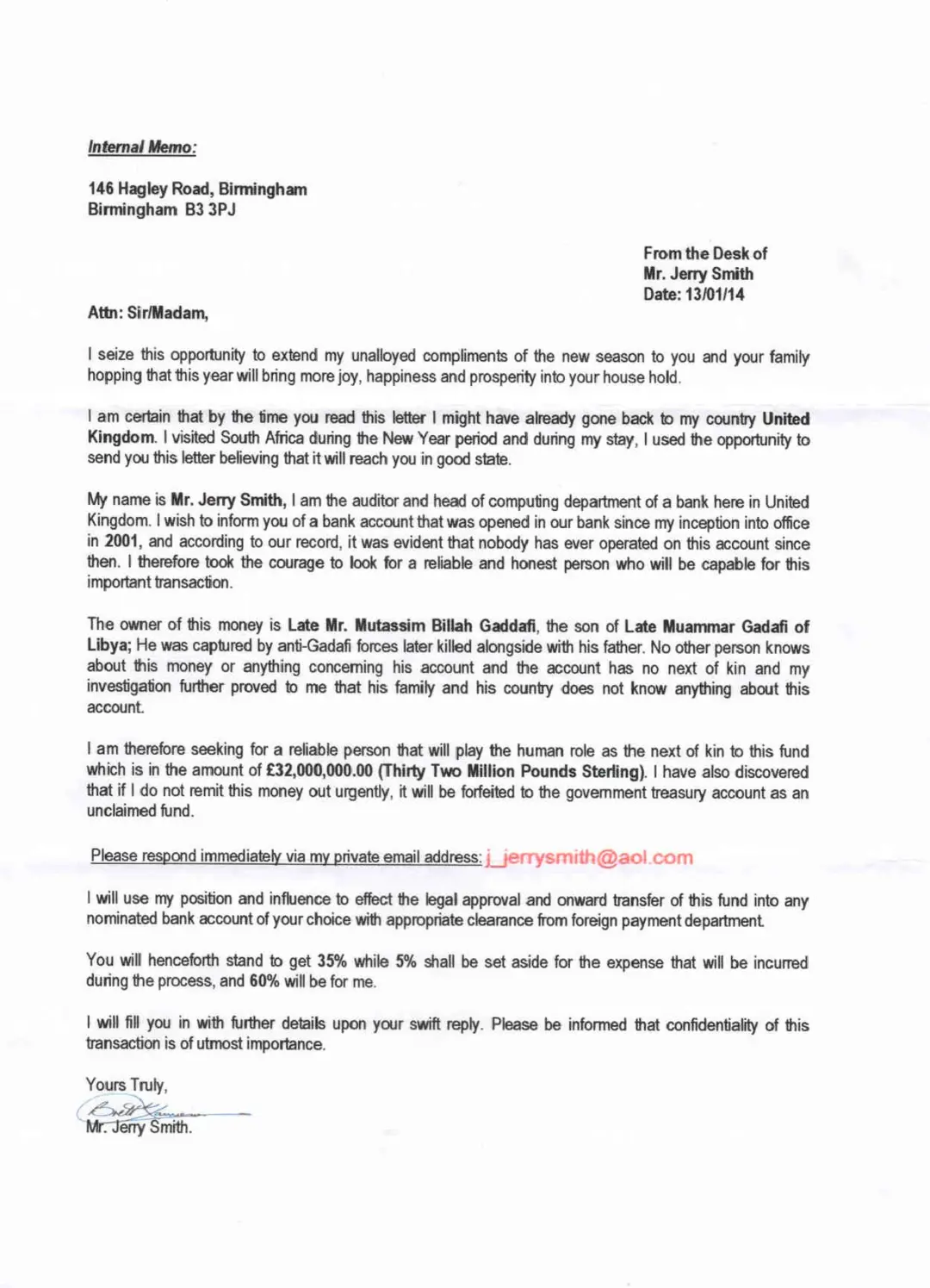 还有一种广撒网的方式。最典型的例子就是尼日利亚王子诈骗短信。骗子会谎称自己是迪拜/尼日利亚/各种国家的王子,因为政变或者其他原因,他的巨额银行账户被冻结了。只要你汇款几百美元给他解冻账户,他会给你巨额账户金额中的相当一部分作为报答。