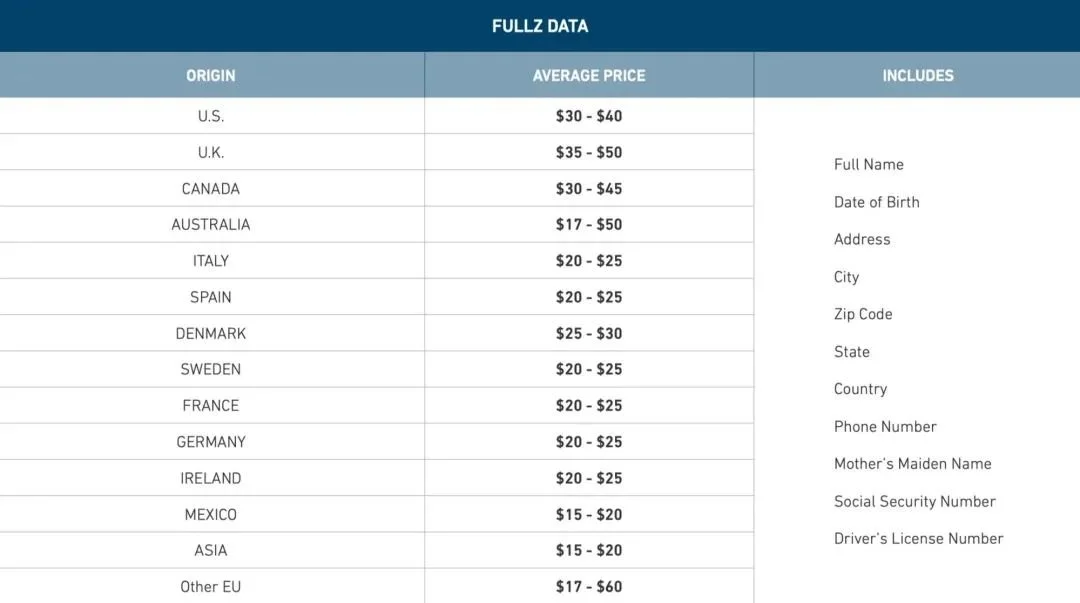 买卖还遵循“嫌贫爱富”的原则。通过地理位置、网购记录、银行账户等信息,可大致描绘出一个用户画像,其中越富裕的用户能够榨取的利益越多。根据安全公司 Armor 2019 年的的黑市调查报告,美国地区的数据为 30-40 美元/人,意大利为 20-25 美元/人,而墨西哥仅为 15-20 美元/人。