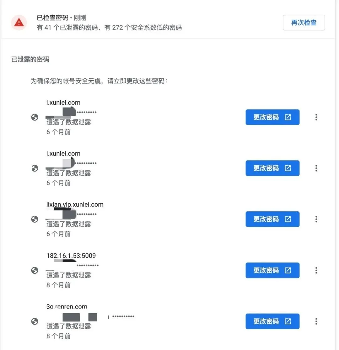 如果你使用 Chrome 浏览器的密码管理器的话,它还会提醒你有哪些密码已经被泄漏了。