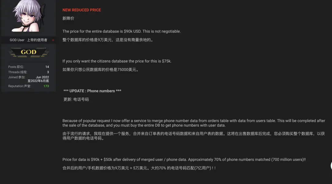 后来这个数据库更新了个人电话号码信息,打包价格涨到了 14 万美元。