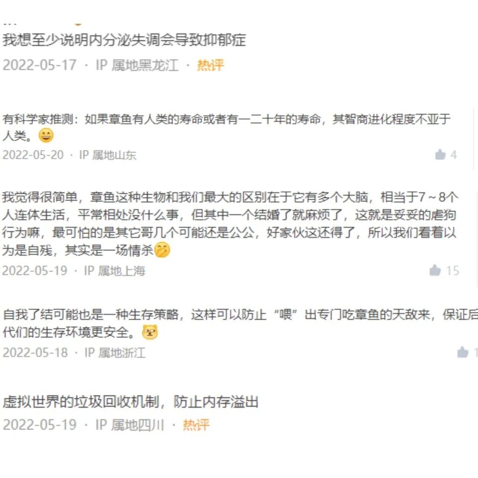 很多人感慨:章鱼生完就死,再一次说明基因是自私的,只要有了下一代,基因得到广泛遗传,上一代死活已经不重要了,略感悲伤!
