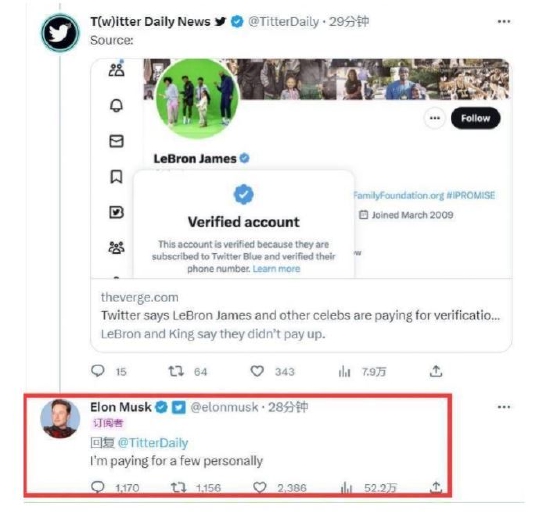在回复金的推文时,马斯克说“不客气”。他在另一条与詹姆斯相关的新闻下评论道:“我个人为几个账户支付了费用。”