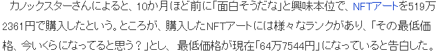 ·当收藏者们还在为到底传统纸质艺术值钱还是前卫数字艺术值钱争的不可开交时,已经有不少“夺盘者”(头茬韭菜)们开始后悔了。这位日本网红就是其中之一,这心情落差与投资股票暴跌没太多分别。