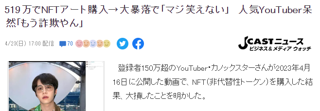 之前突然爆火的NFT的吃螃蟹者们现在后悔了么?近日一位日本主播网红怒斥NFT就是真实网络诈骗,之前花500多万日元购买的NFT暴跌近9成,现在只值64万日元,还不知道谁肯接盘。