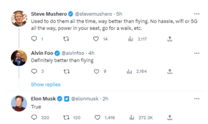 符传志回应称,“肯定比坐飞机好”。美国企业家马斯克还直接在下方回应称,“的确”。