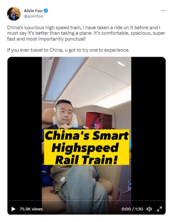 认证为美国风投公司ChainValley Capital合伙人的符传志(Alvin Foo)日前发帖为中国“复兴号”高铁点赞,在评论区引发不少网友共鸣。符传志在配文中称,“中国的豪华高铁。我坐过,不得不说比坐飞机还要好。它舒适、宽敞、超级快,最重要的是准时!如果你去中国旅行,一定要体验一下”。