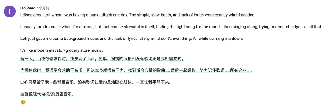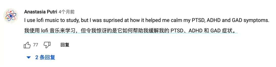 在相关评论区,你甚至可以看到有网友说 Lofi 歌曲缓解了他们的 PTSD 、 ADHD ( 多动症 )、 GAD ( 广泛性焦虑 )。