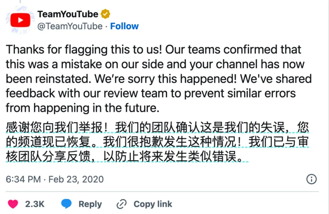 第二次被关停,是 YouTube 官方在没有任何说明时操作的。遭到大家强烈反对后, YouTube 赶紧恢复了频道,而他们对此解释只是失误。