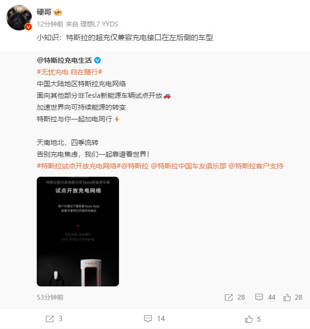 据特斯拉充电生活官方消息,中国大陆地区特斯拉充电网络,现已面向其他部分非Tesla新能源车辆试点开放,也就是说无论是蔚来、小鹏还、理想亦或者比亚迪等,都可以使用特斯拉的充电桩进行充电了,估计这下怕是特斯拉的车主要不高兴了。
