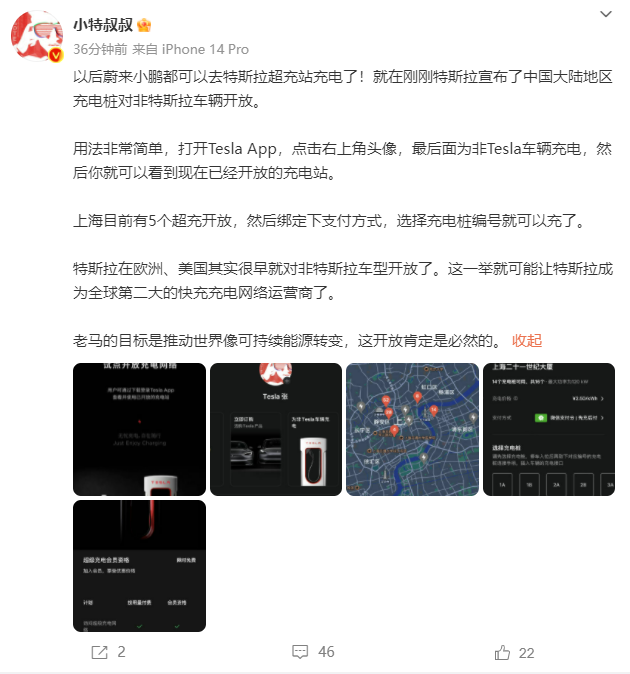 那么具体该如何使用呢?博主@小特叔叔 在线进行了科普:用法非常简单,打开Tesla App(没有需下载),点击右上角头像,最后面为非Tesla车辆充电,然后你就可以看到现在已经开放的充电站,上海目前有5个超充开放,然后绑定下支付方式,选择充电桩编号就可以充了。