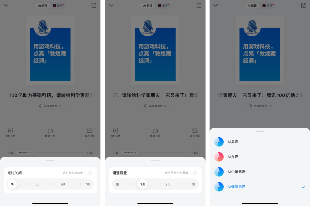 “微信读书”有AI男声、AI女声、AI中年男声以及AI催眠男声四种声音可以选择,还可以调整语速快慢、设定“定时关闭”。