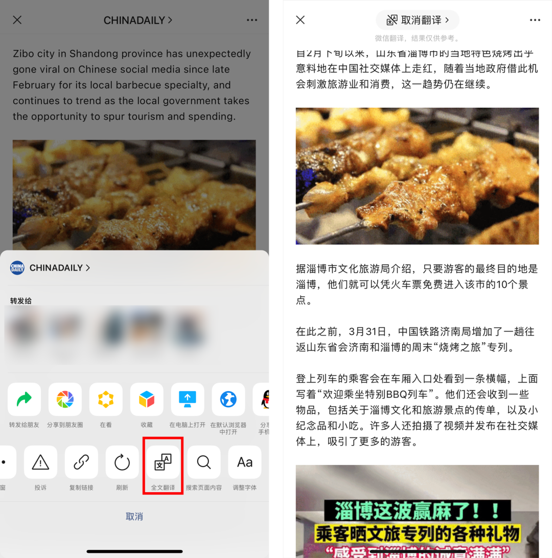 “全文翻译”,文章内容就会自动翻译成中文,多国语言不是事儿。