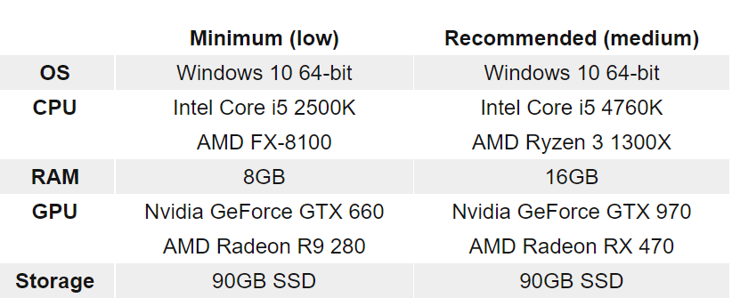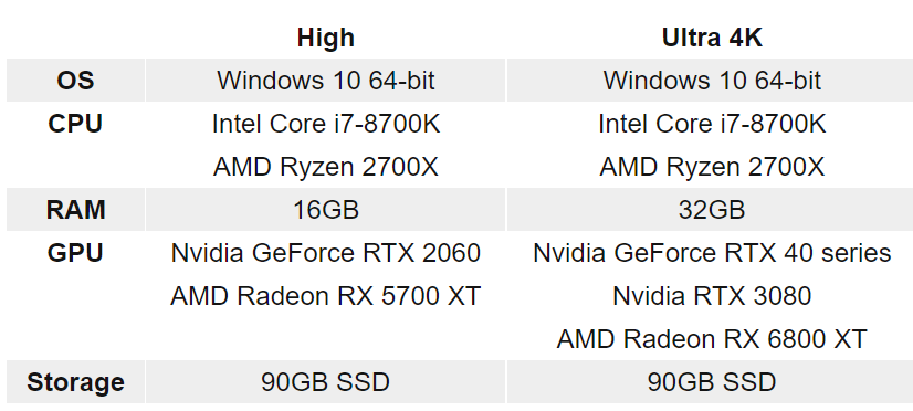 但是高画质及4K Ultra下的要求提高不少,前者都要RTX 2060或者RX 5700 XT显卡,4K下更是需要32GB内存、6-8核处理器、RTX 3080或者RX 6800 XT显卡,甚至是RTX 40系列显卡。