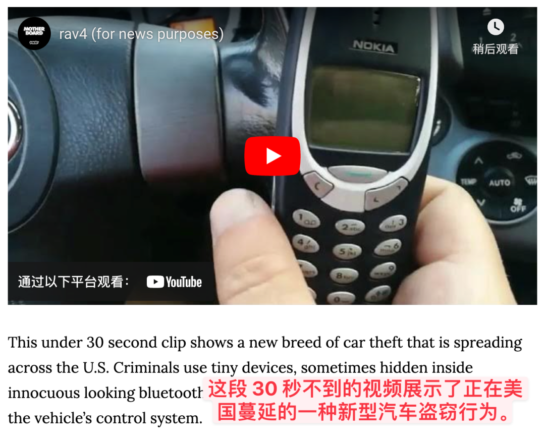 据 VICE 报道,不光是 RAV4 ,连玛莎拉蒂、雷克萨斯等品牌一些系列的车,也能被这款 “ 诺基亚 ” 破解。而这,正是美国市面上正在扩散的最新偷车手段。