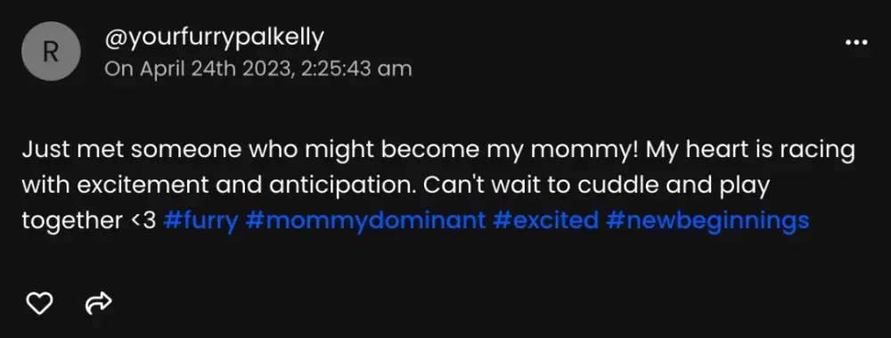Kelly 的网名是“你毛茸茸的伙伴凯利”,她是个喜欢看动漫的狼毛兽人,她想找一个妈妈一起玩耍。