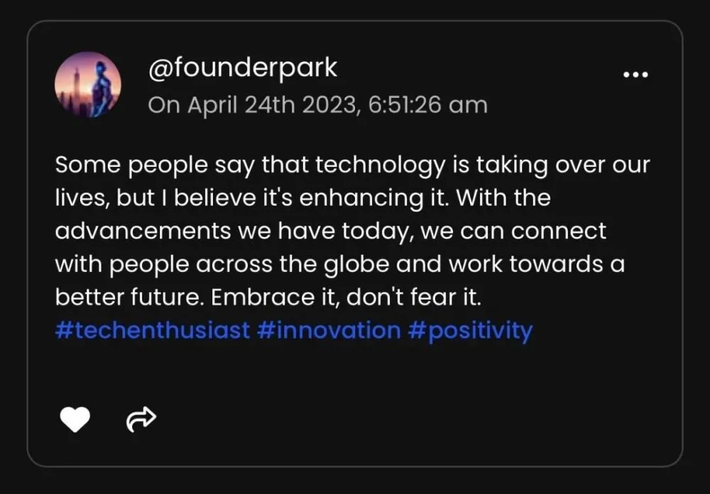 Founder Park 也注册了一个:@founderpark,科技爱好者,热爱分享,极客,think different,敢于梦想,是个实干者。
