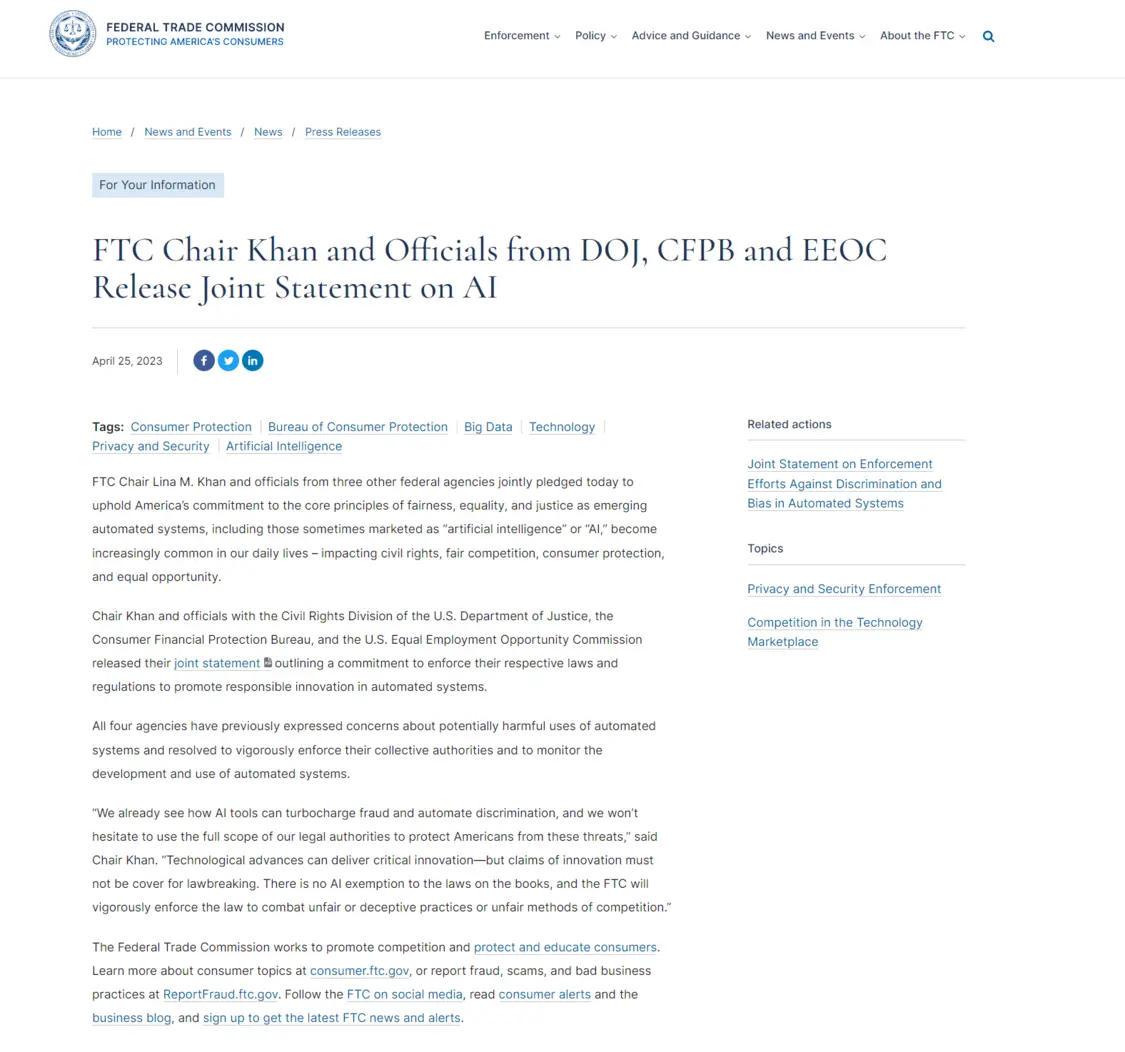 美国联邦贸易委员会主席Lina Khan在声明中表示,“我们已经看到人工智能工具如何加剧欺诈和自动化歧视,我们将毫不犹豫地利用我们的法律权力来保护美国人免受这些威胁。”
