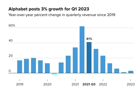 虽然总体看来Google本季度业绩并未继续恶化,但如果我们拉长时间线,会发现Google目前仍然没有走出低迷的状态,并且关键业务面临的挑战还更大了。Google本季度3%的营收增长,是自2019年来第三慢的营收增速。