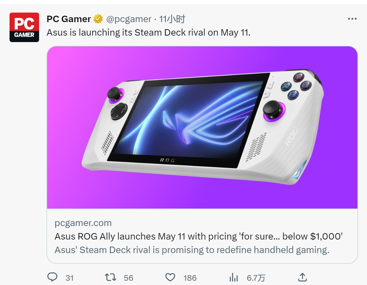 据华硕官推,他们将于5月11日正式公布ROG Ally的定价、配置和发售地区。据外媒,ROG Ally的定价不到1000美元,有大量媒体报道,ROG Ally将于5月11日发售。