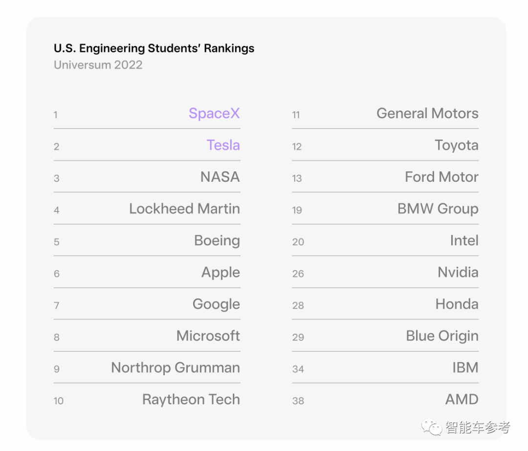 而且在吸引工程方面的人才这一点,特斯拉在全美所有公司中排名第二,超过NASA、苹果、谷歌、微软。