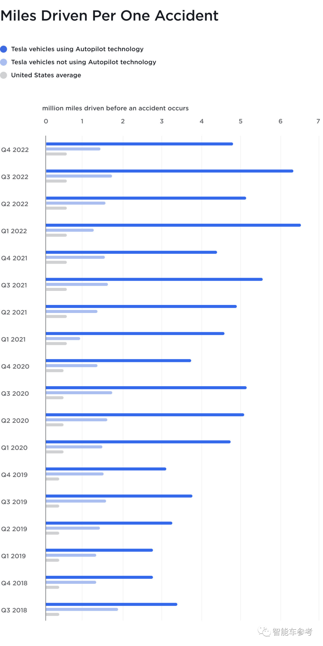 作为参考,2018年,美国大约每48.1万英里就会发生一起事故;22年,美国大约每65.2万英里就会发生一起事故。