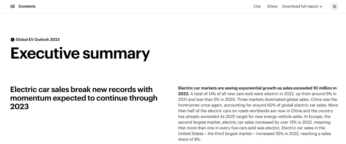 该机构表示,在第二大市场欧洲,2022年电动汽车销量增长了15%以上,这意味着每售出的五辆汽车中就有超过一辆是电动汽车;美国电动汽车销量在2022年增长了55%。