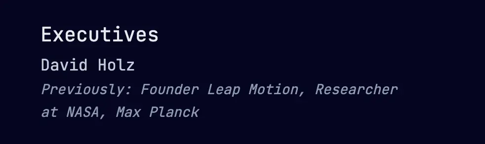 Midjourney官网上,关于David Holz的此前经历的介绍非常简洁:Leap Motion创始人;NASA和Max Planck研究员。