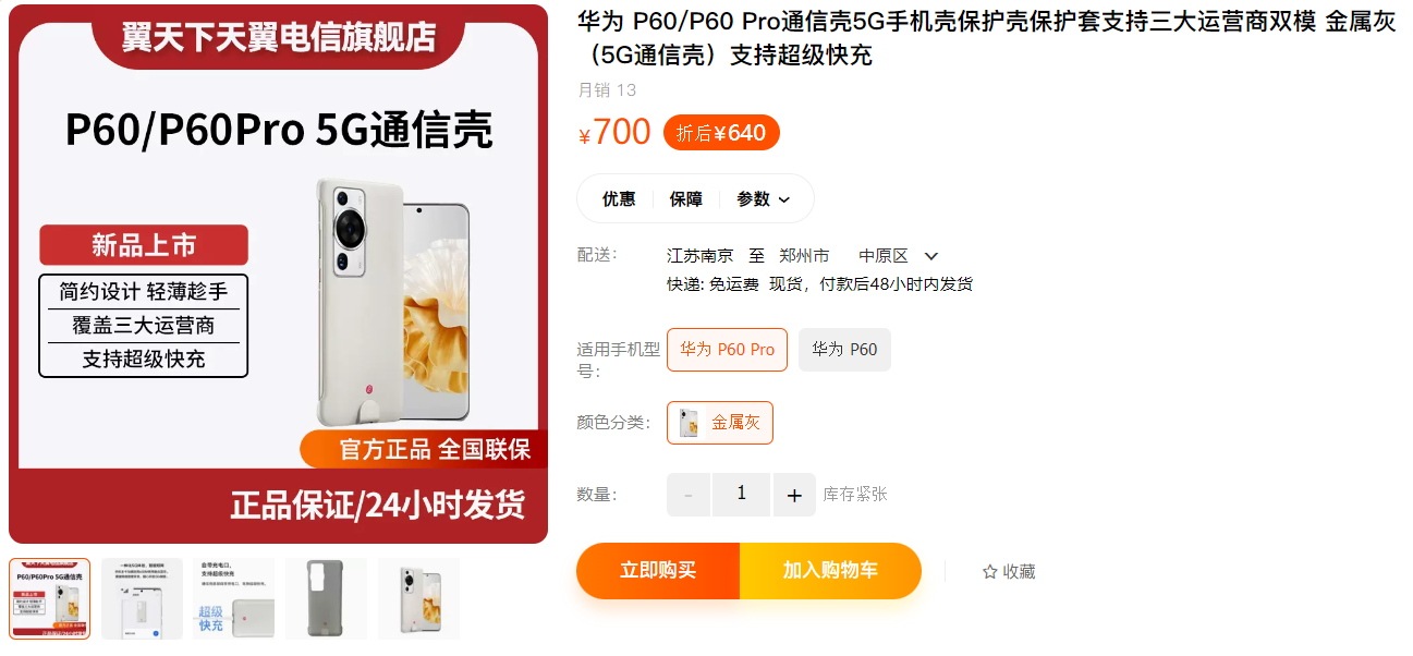 满血5G状态的终极版华为P60系列来了!近日电信官方的天猫旗舰店上架了华为P60/P60 Pro的5G通信壳,能实现三大运营商的双模5G网络连接。根据此前的认证信息显示,这款5G通信壳依然来自数源科技(SoyeaLink)。