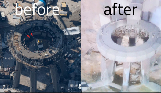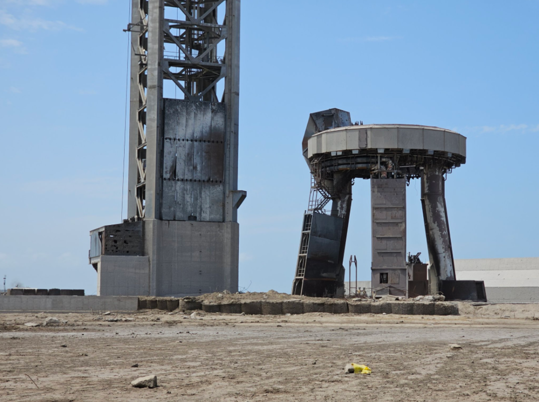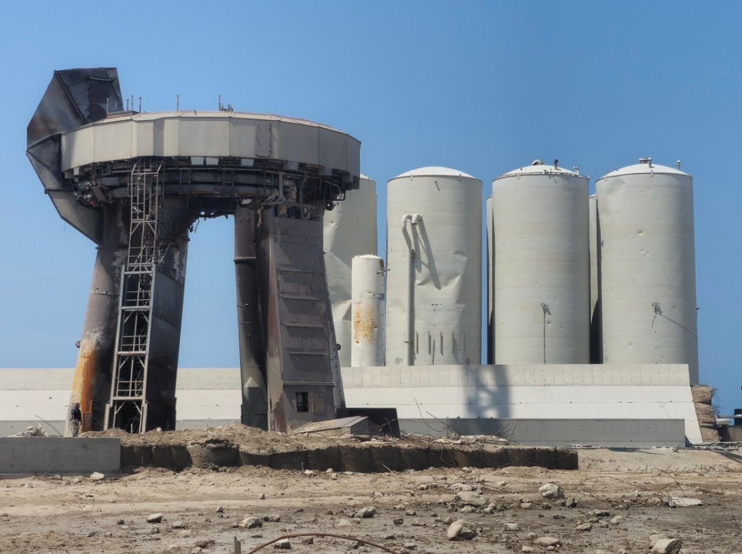 结果,超重-星舰起飞时喷射的高速射流直接破坏了发射台台底的水泥基座,部分石块甚至飞到几百米外的海面上,而飞起的碎片也使得发射台附近的燃料罐、吊车和转播车等受到不同程度的破坏。