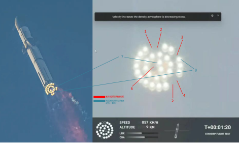从飞行视频中给出的遥测信息看,超重-星舰点火时有3台发动机未正常起动,起飞后动力系统连续出现异常现象,包括异常闪光、爆燃、喷流异常、推力丧失等。