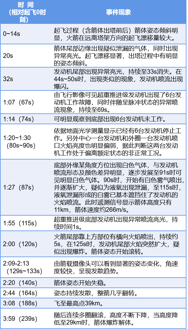 在上升过程中,发动机喷流多次出现爆燃情况,更多发动机工作异常,整体速度、高度均远远低于公布的理论情况,飞行至169s时没有按照既定程序级间分离。
