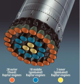推进级带有33台猛禽发动机,其中中圈10台、内圈3台可十字摆动,摇摆幅度±15°,外圈20台固定不摇摆。