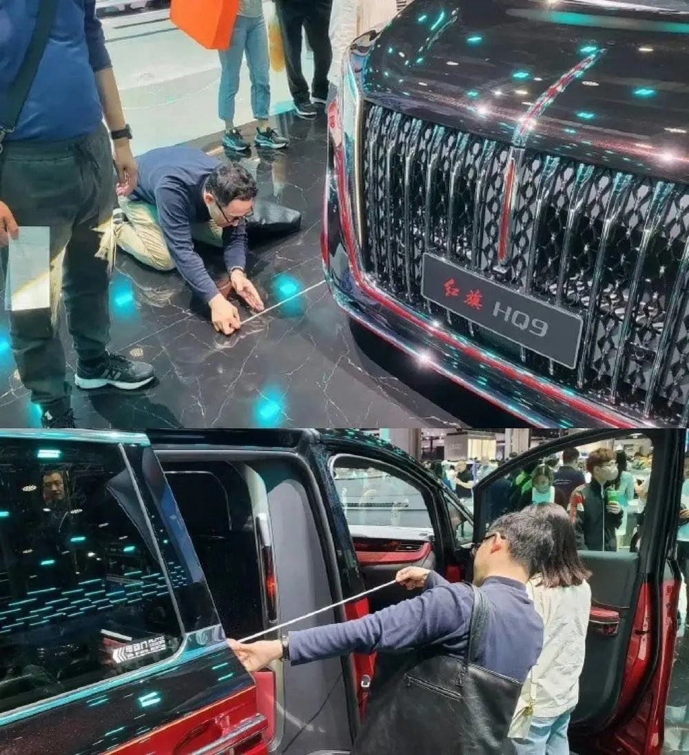 与德国人的体面访问不同,日本人在上海车展上,祭出了“跪地量车”的大招。一人负责对车长、车高等细节进行测量,一人仔细记录着各项数据。两人在现场旁若无人的操作,可谓是将“躬匠精神”发挥得淋漓尽致:原来日本车企也有皮尺部。