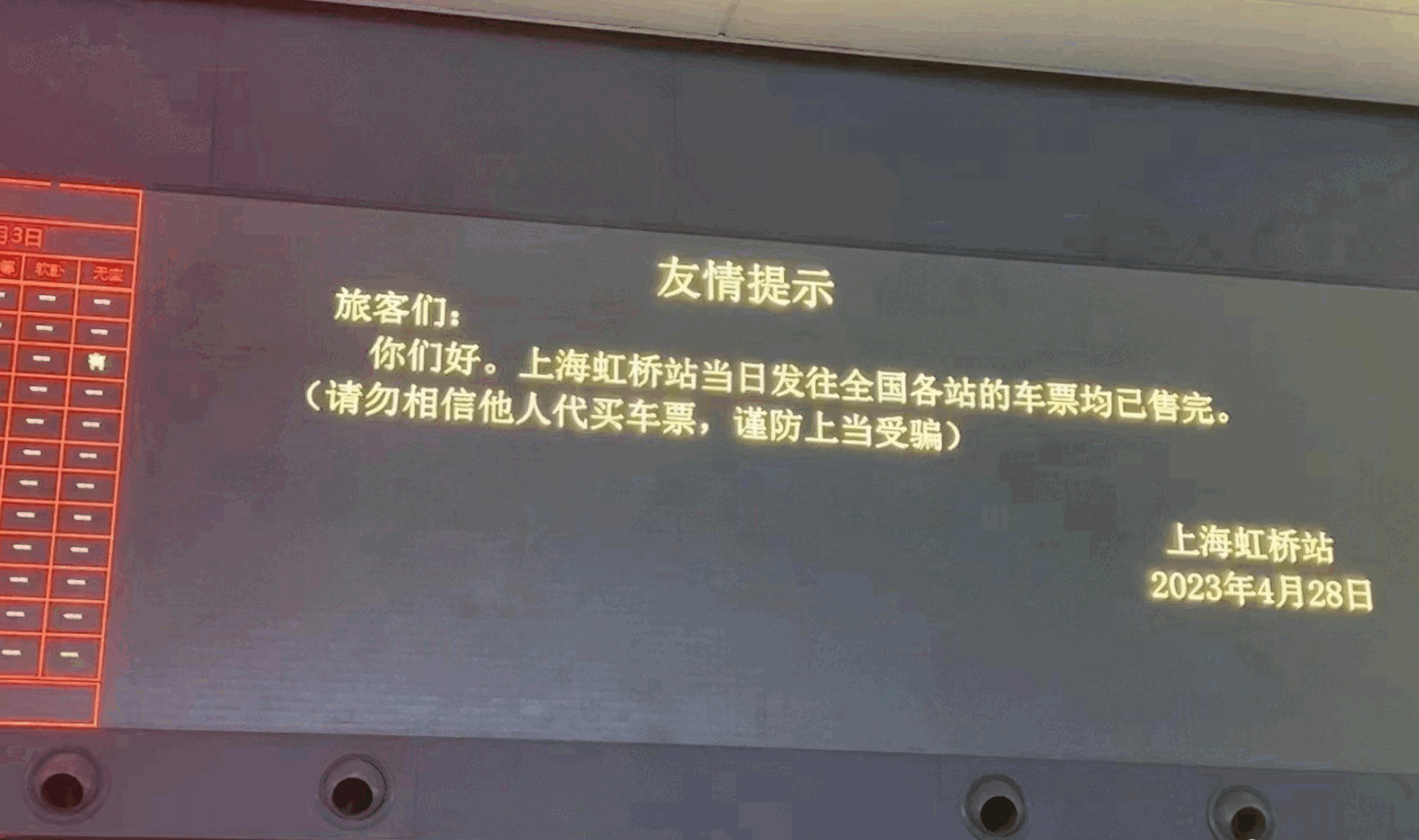 五一假期开启前一天,准备回家、旅游的朋友们,已经提前出发,国内不少地方车站,车票已经售罄。4月28日消息,据“澎湃新闻”报道,铁路上海站方面获悉,上海虹桥火车站4月28日发往全国各站车票均已售完。