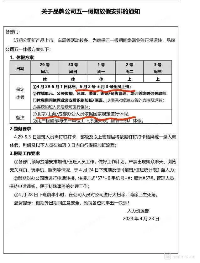 4月28日消息,五一假期临近,加班问题受到大家关注。近日,有认证为长城汽车的脉脉网友爆料称,公司发布放假安排通知显示,5月2日-3日全员上班。公司仅北京、上海、成都办公人员依据国家规定进行休假。