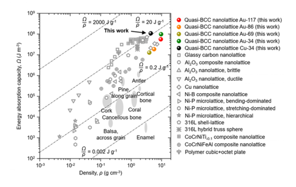 图1.金和铜准体心立方纳米梁晶格和已报道的微/纳米梁晶格力学超材料的单位体积能量吸收与密度的阿什比图