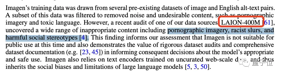 早在Imagen发布时,也专门针对LAION-400M做出警示:因为依赖于这种未经整理的网络数据, 集成了大模型的社会偏见和限制,因此不适合公开使用。